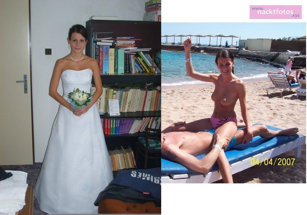 eheschlampe oben ohne am strand mit hochzeitsfoto